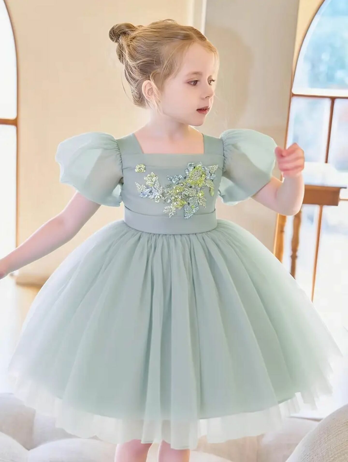 This versatile dress works beautifully for flower girls, junior bridesmaids, birthday parties, garden parties, Easter celebrations, family photos, or any formal event. The gentle sage green shade complements various wedding color palettes and looks stunning in both indoor and outdoor settings.