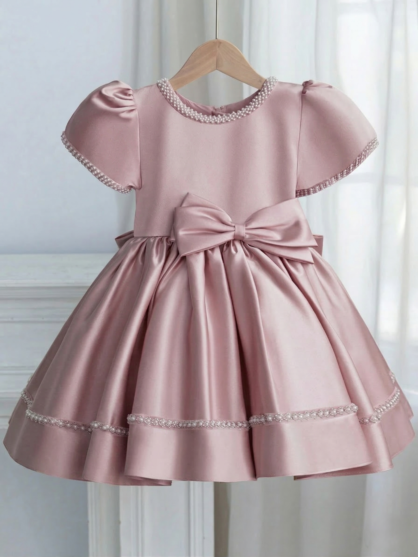 The smooth lustrous dusty pink satin bodice is elevated by an exquisite pearl bead trim that delicately outlines the round neckline and frames each short sleeve, lending a sophisticated vintage charm reminiscent of couture bridal fashion. The full A-line skirt features two bands of coordinating pearl and crystal bead trim near the hem, adding a refined decorative finish that catches the light beautifully with every step. The front waist bow creates a charming, polished focal point, while the back reveals the true showpiece of this gown — an extraordinarily oversized structured satin bow with dramatically long pointed tails that cascade beautifully, creating a statement silhouette that photographs magnificently from every angle.