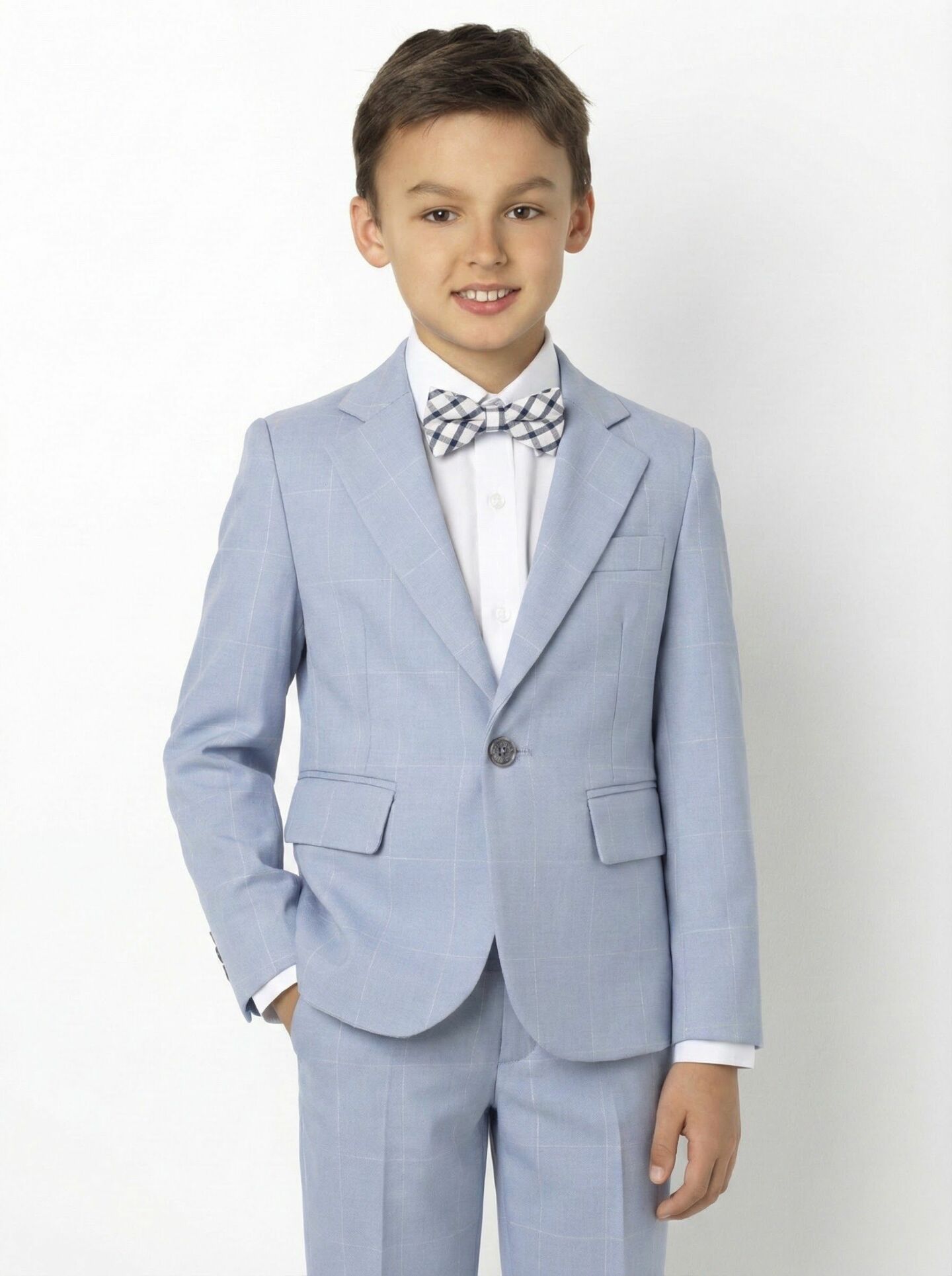 Elevate any formal outfit with the Alexis blazer in bice windowpane check. This sophisticated jacket brings elegant formal styling with its subtle pattern and refreshing colour that pairs beautifully with navy, charcoal, or matching light blue trousers you already own, making it a versatile addition to boys' formal wardrobes.