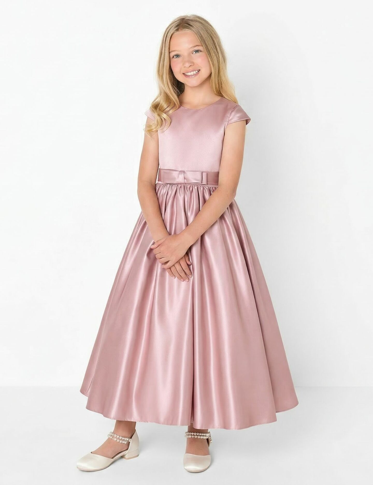 Capture timeless sophistication with the Alison dress, an elegantly refined dusty pink satin girls' formal gown that delivers understated luxury from every angle. With its clean minimalist silhouette, premium lustrous satin fabric, and beautifully detailed bow design, Alison is the ideal choice for girls who appreciate classic elegance — perfect for junior bridesmaids, flower girls, and distinguished formal celebrations alike.