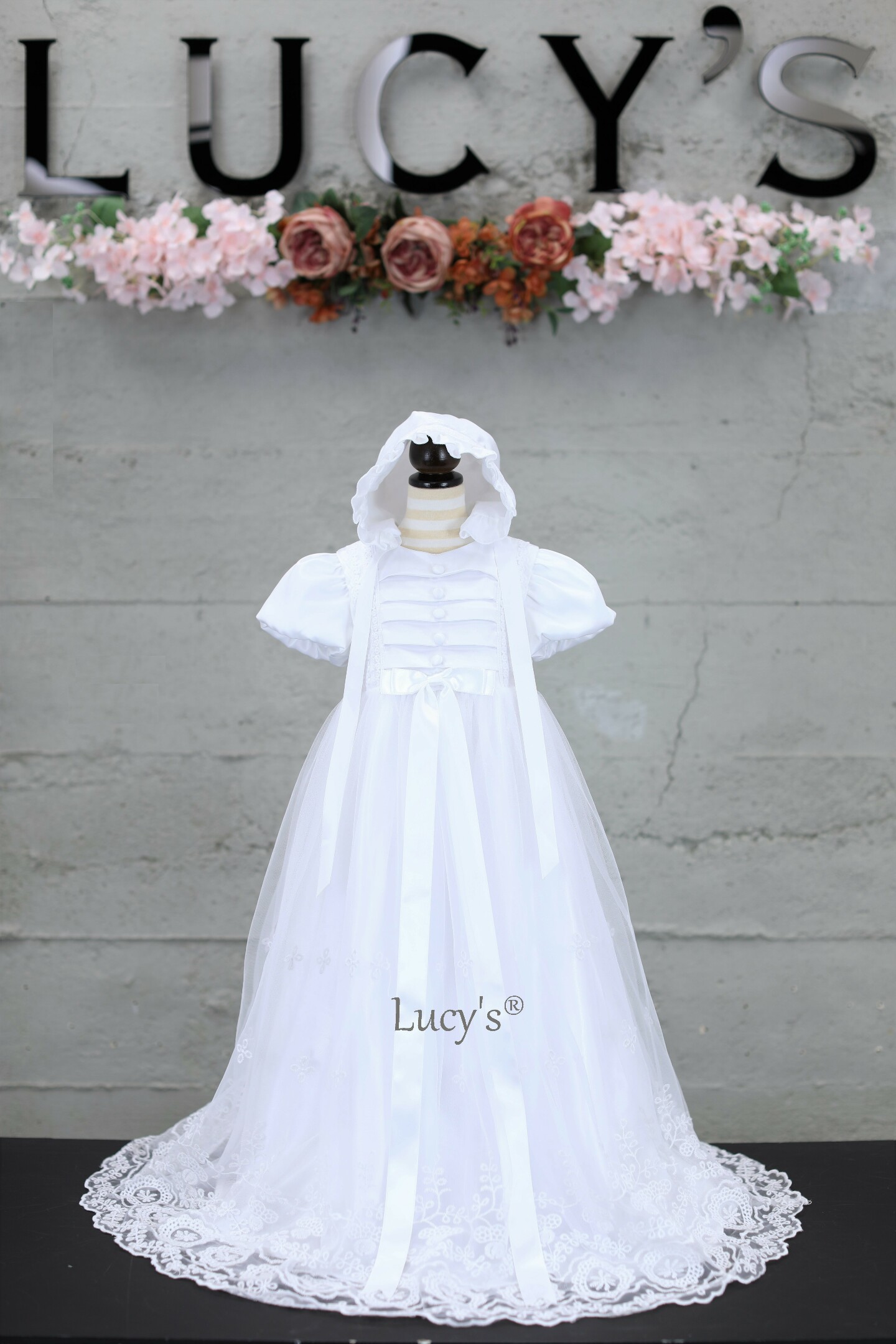 Presenting our adorable Baby Girl Christening Dress, beautifully crafted with delicate lace and soft satin. This heirloom-quality gown features intricate detailing, providing your little one with ultimate comfort on her special day.