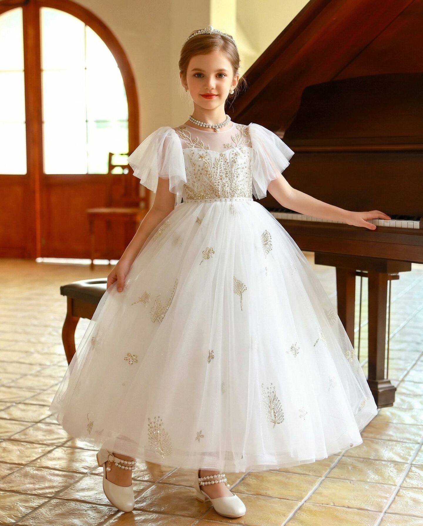Step into a fairy-tale garden with the Ariana dress, a breathtakingly ethereal white girls' formal gown adorned with exquisite all-over gold botanical embroidery that transforms every step into pure magic. Inspired by the enchantment of a secret garden in bloom, Ariana is the perfect choice for flower girls, junior bridesmaids, and any special occasion where romantic, nature-inspired luxury is desired.