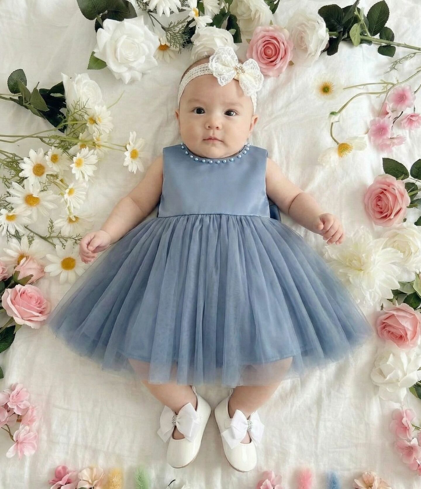 Dress your little one in enchanting elegance with the Aurelia baby flower girl dress, a beautiful dusty blue gown designed to make her first special occasions truly unforgettable. This charming dress combines delicate pearl detailing with a dreamy tulle skirt, creating the perfect balance of sophistication and sweetness for babies and toddlers.