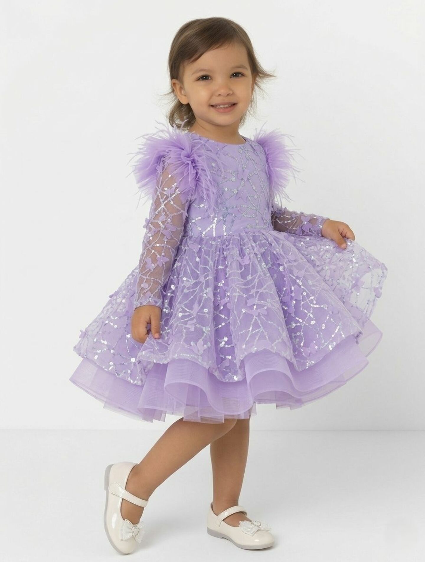 Make her special day unforgettable with the BoBo baby party dress in enchanting lavender. This show-stopping celebration dress combines sparkling sequin details with whimsical feather accents, creating a glamorous look designed for birthdays, milestone events, and festive gatherings.