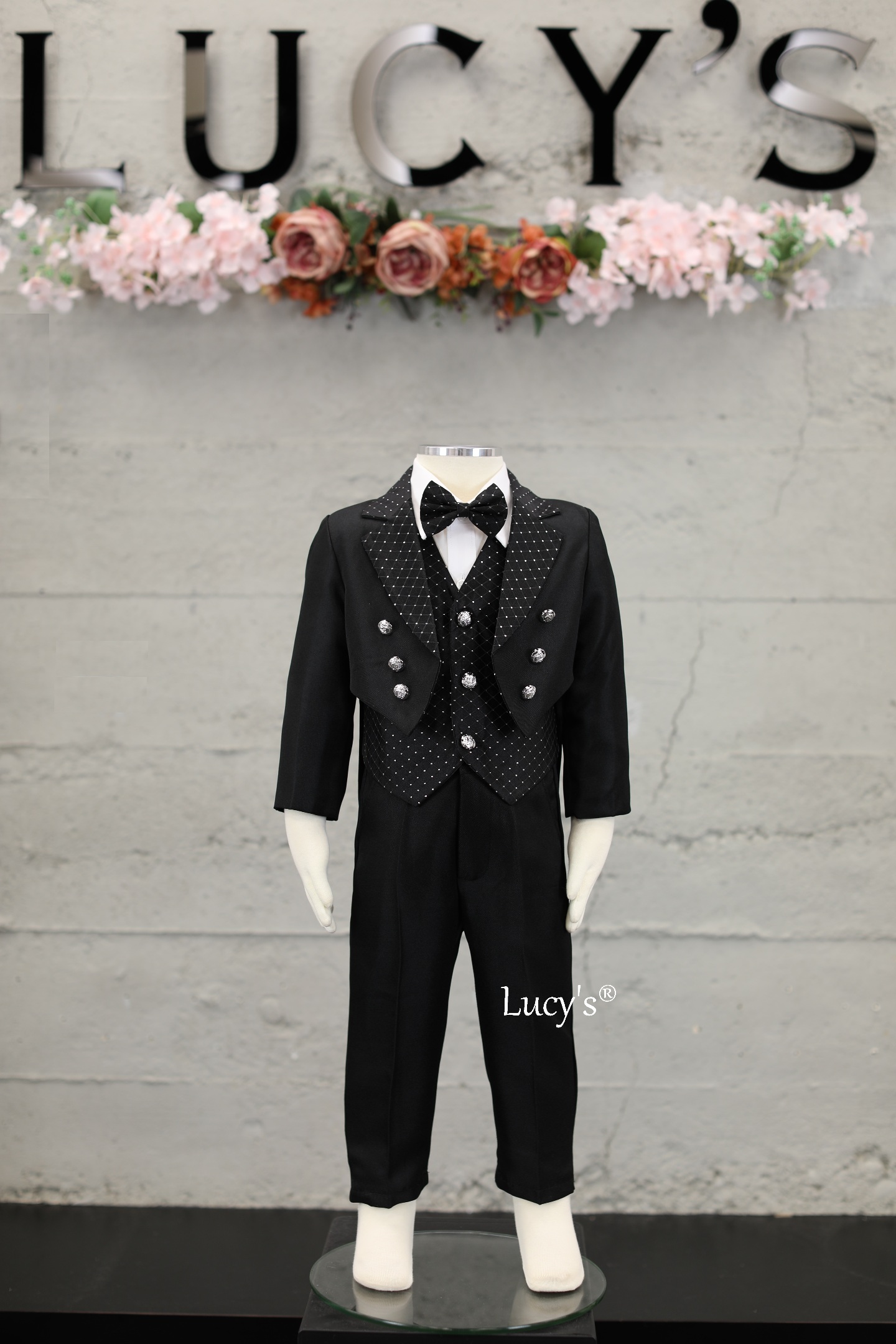 Boy 5pc Black Suit includes Jacket, Waistcoat, Trouser, Shirt, and Bowtie