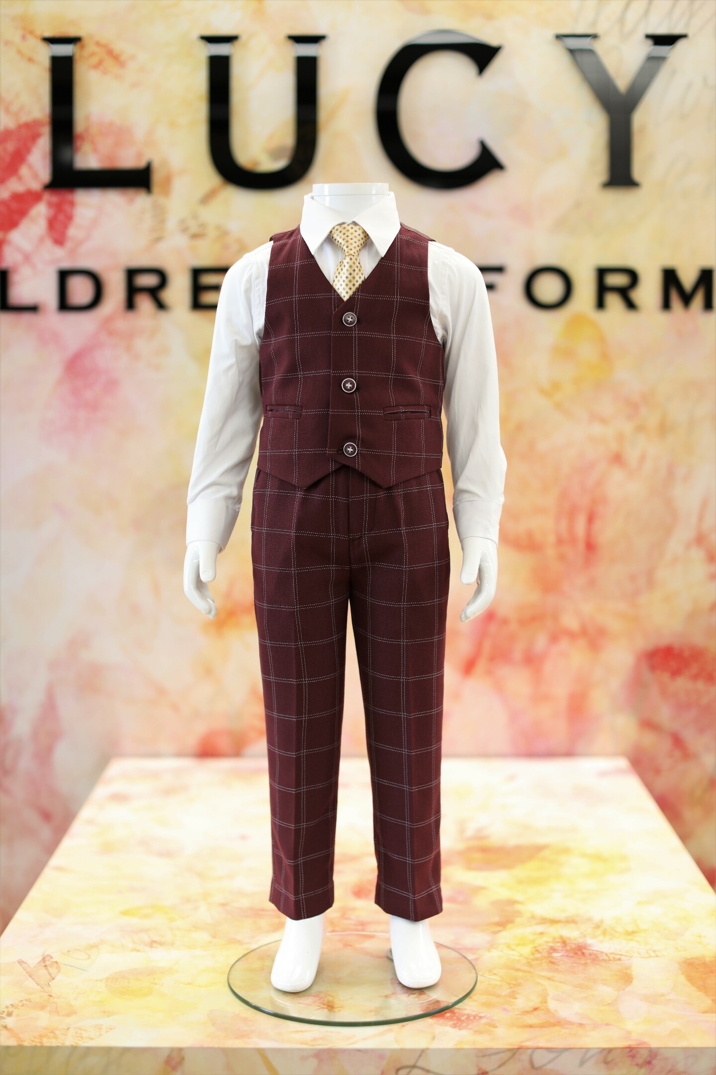 Boys 2pc Maroon Check Classic Tailored Waistcoat Suit - Truman