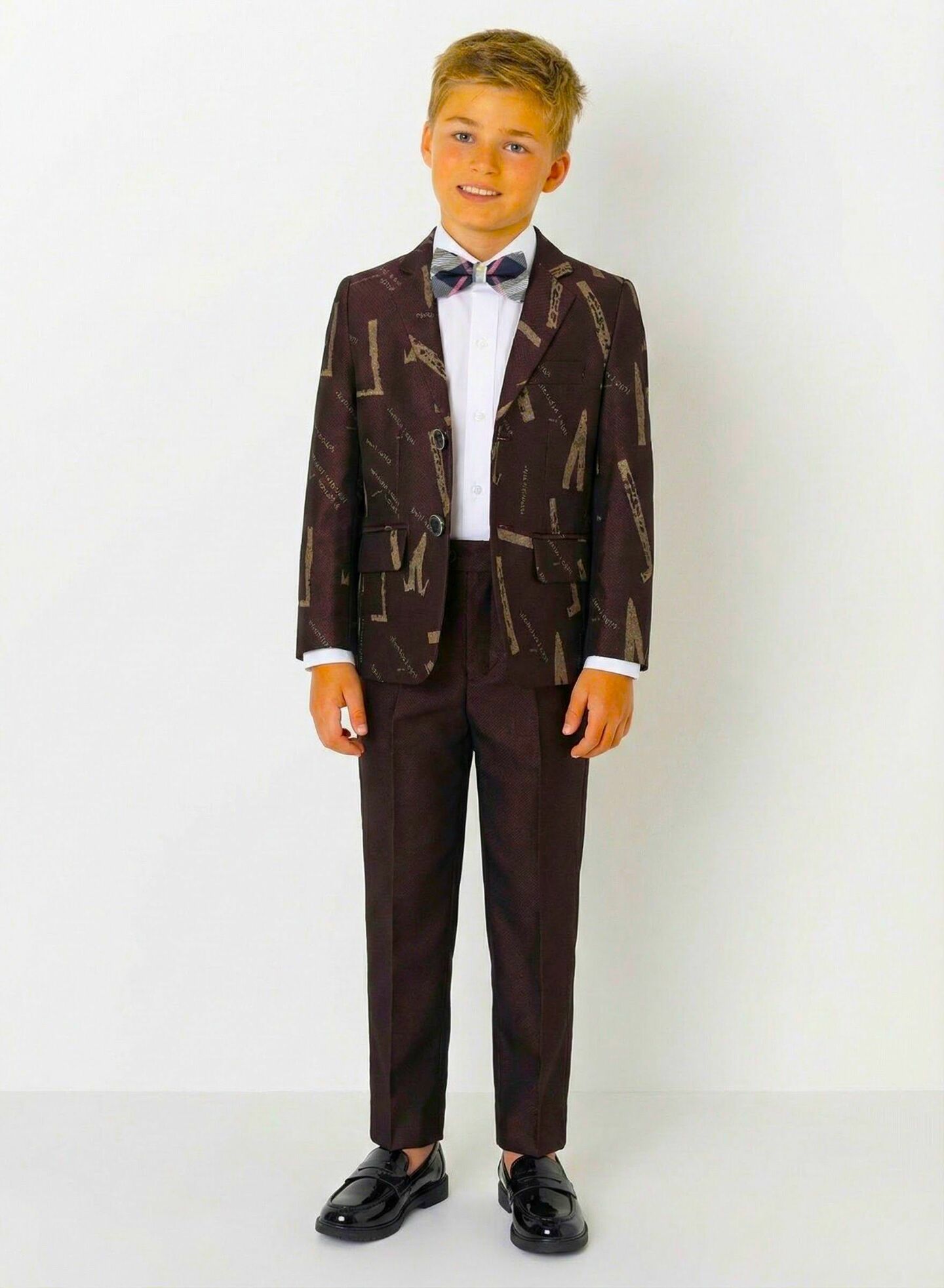 Make a modern statement with the Carlos 2-piece suit featuring a distinctive abstract print jacket paired with coordinating solid maroon trousers. This contemporary combination delivers sophisticated formal style with unique visual appeal, perfect for boys attending weddings, formal ceremonies, and special celebrations.