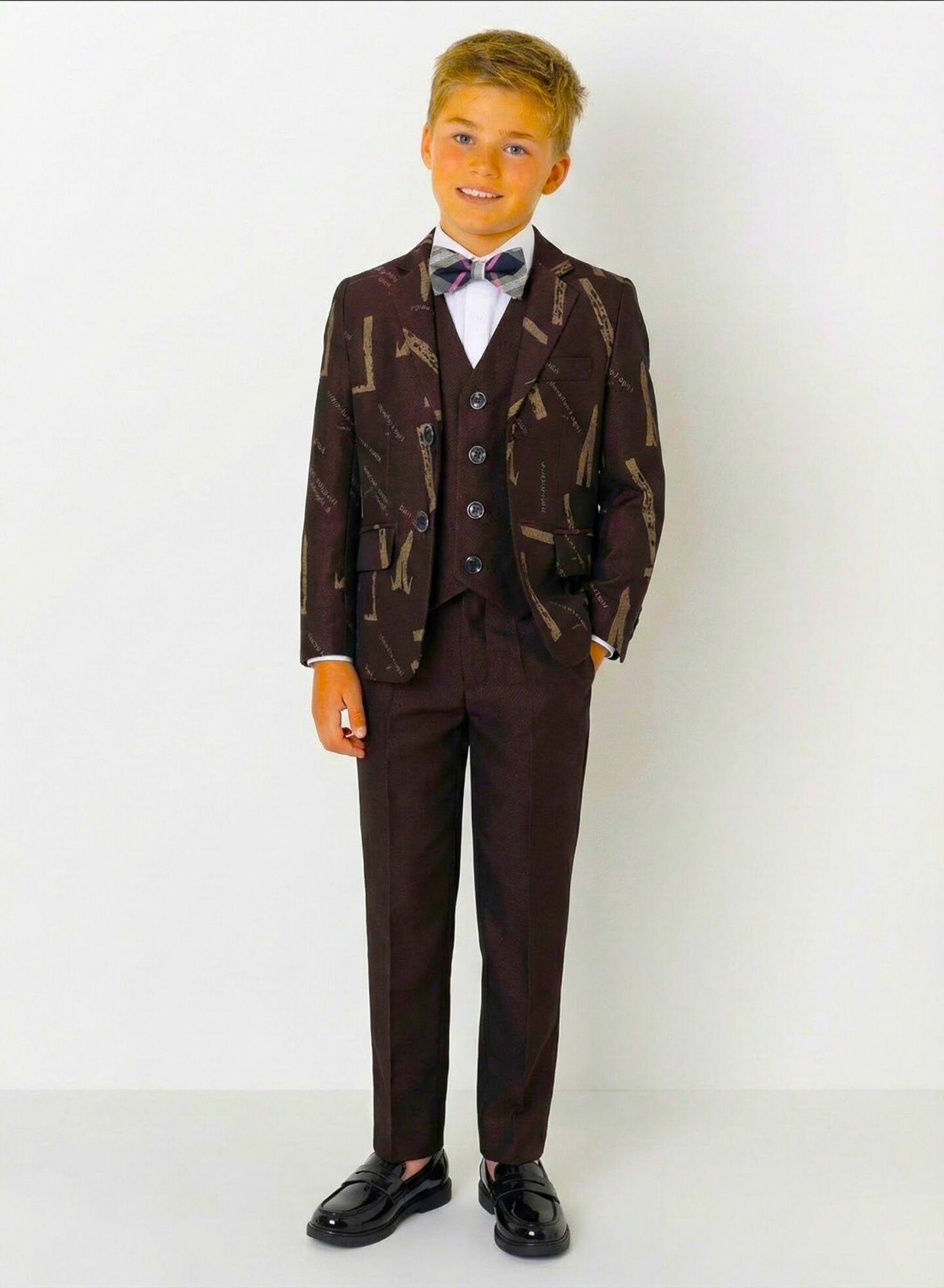 Perfect for ring bearers, page boys, modern weddings, bar mitzvahs, formal celebrations, and special occasions where unique style makes a statement. The sophisticated brown tones work beautifully for autumn and winter events, while the modern pattern appeals to fashion-forward young gentlemen.