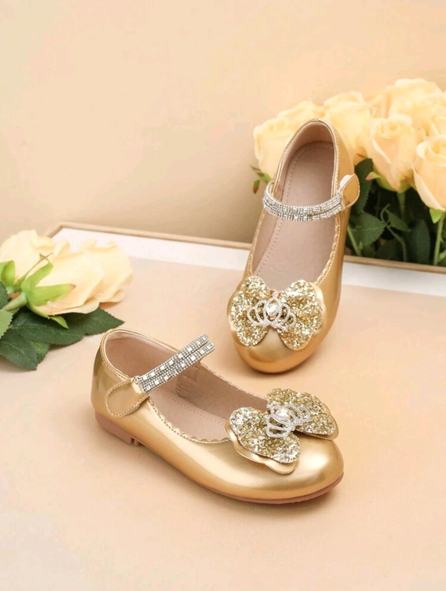 - Product Name: Children Girls Dress Shoes with Butterfly Crown (Gold)