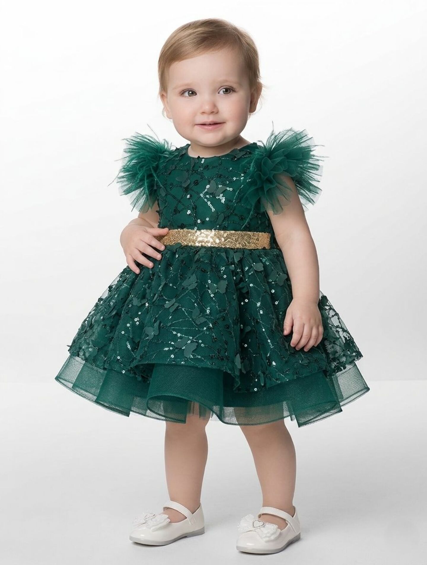 This stunning party dress is ideal for first birthday celebrations, holiday gatherings, Christmas parties, family photos, weddings, christenings, or any special occasion where your little one deserves to shine. The rich forest green and gold combination creates a regal, festive palette that photographs beautifully and complements the season's most elegant celebrations.