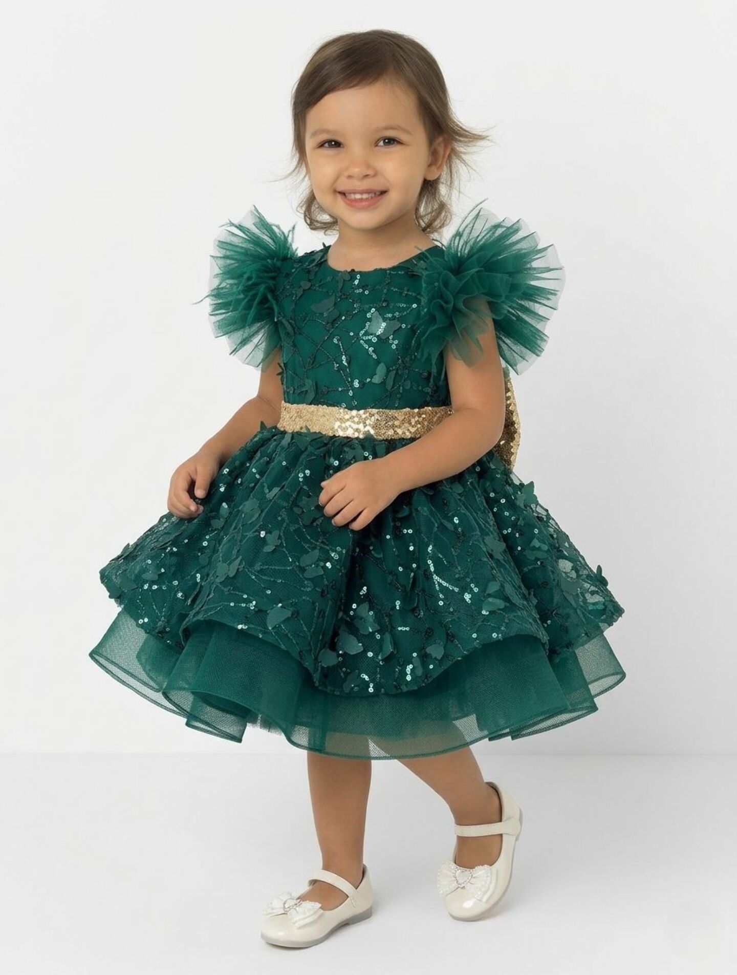 The bodice and skirt feature intricate vine-inspired sequin embroidery with dimensional floral lace appliqués, creating a richly textured design that catches the light from every angle. Voluminous tulle puff sleeves in matching forest green add a playful, princess-worthy touch, while a sparkling gold sequin waistband elegantly defines the silhouette. The back of the dress is crowned with an oversized gold sequin bow — a stunning statement detail that ensures she looks picture-perfect from every direction. The layered skirt flows beautifully with a soft tulle underskirt peeking beneath the embellished overlay, creating a twirl-worthy silhouette that little ones will adore.