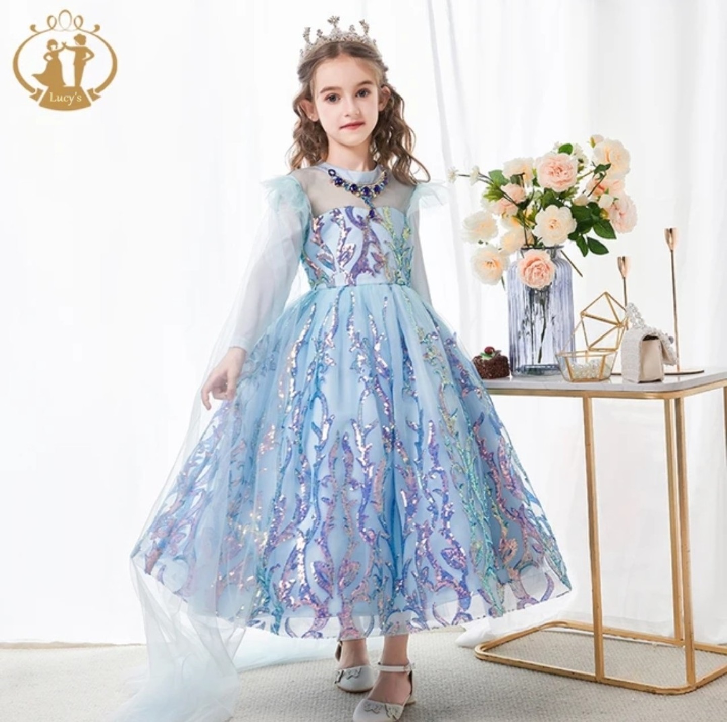 Presenting our Long-Sleeve Light Blue Party Dress with Cape for girls, an enchanting choice for birthday parties and other special occasions. This beautiful ensemble is crafted from premium fabric with professional tailoring and fine handwork. The matching cape adds a touch of magic and whimsy, perfect for your little princess. The light blue color imbues an air of elegace and charm, sure to make your little one the belle of any ball.