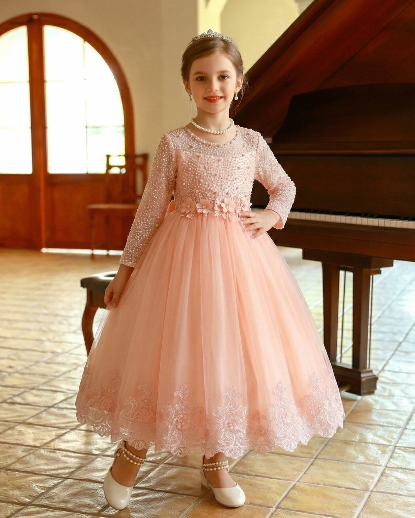 An extraordinary choice for flower girls, junior bridesmaids, birthday galas, spring and autumn weddings, recitals, formal portraits, and any distinguished occasion where lavish embellishment and romantic elegance are equally desired. The peach hue coordinates beautifully with blush, mauve, gold, and neutral wedding colour palettes.