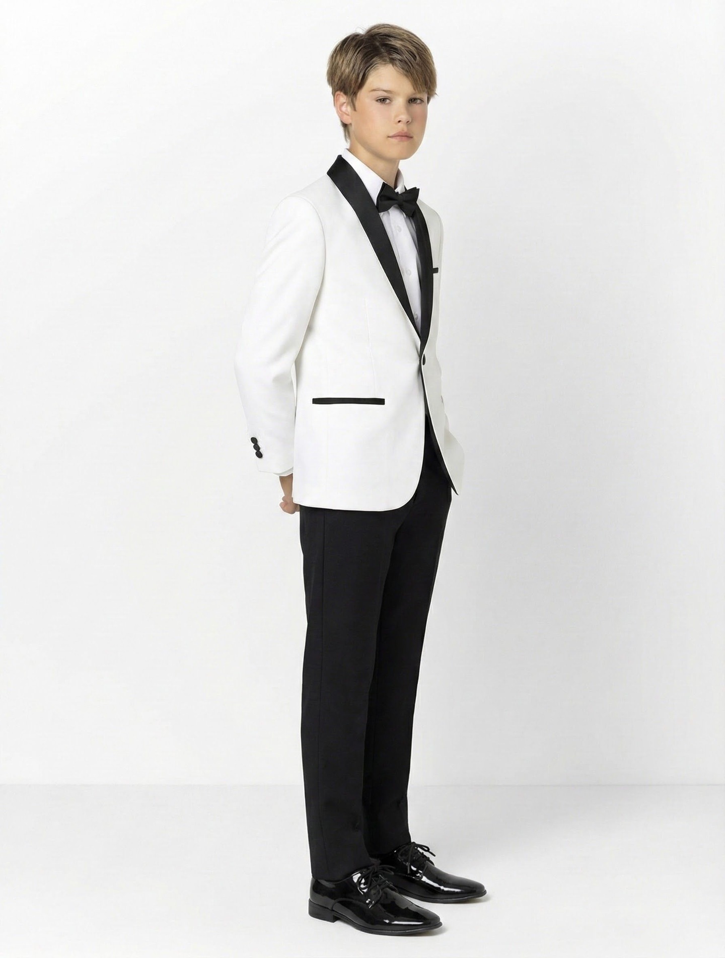 Achieve timeless formal elegance with the Fernando 2-piece tuxedo featuring a distinguished white dinner jacket with black satin shawl lapel paired with coordinating black dress trousers. This classic combination delivers sophisticated formal style perfect for boys attending weddings, formal ceremonies, and prestigious celebrations.
