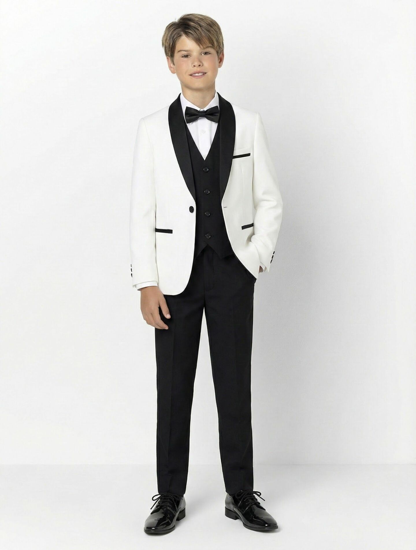 Perfect for ring bearers, page boys, upscale weddings, formal galas, black-tie events, quinceañeras, first communion, milestone celebrations, and distinguished formal occasions where classic elegance is essential. This timeless white and black combination photographs beautifully and ensures young gentlemen stand out with sophisticated style.