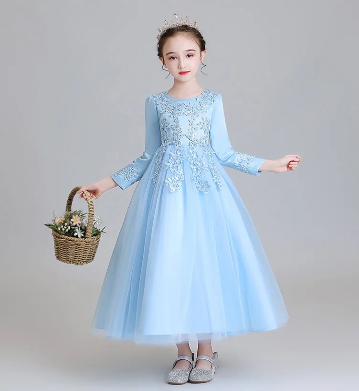 Girl's Long Sleeve Lace Velvet Wedding Bridesmaid Party Dress - Chelsea (Light Blue)
