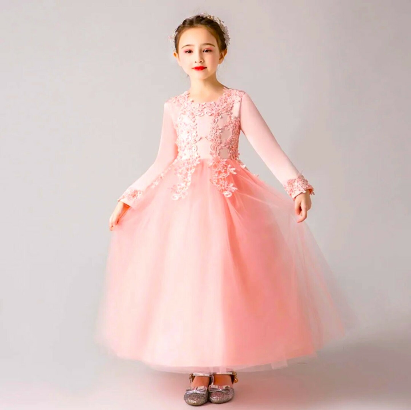 Girl's Long Sleeve Lace Velvet Wedding Bridesmaid Party Dress - Chelsea (Peach Pink)