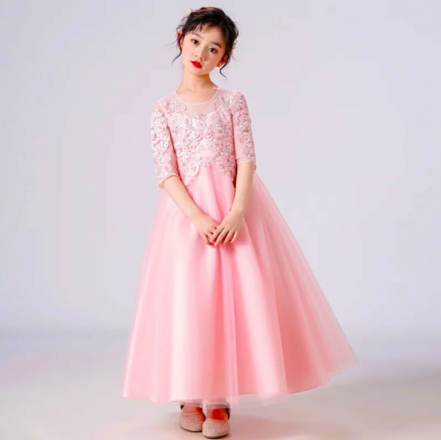 Girl's Long Sleeve Lace Wedding Bridesmaid Party Dress - Lily (Peach Pink)