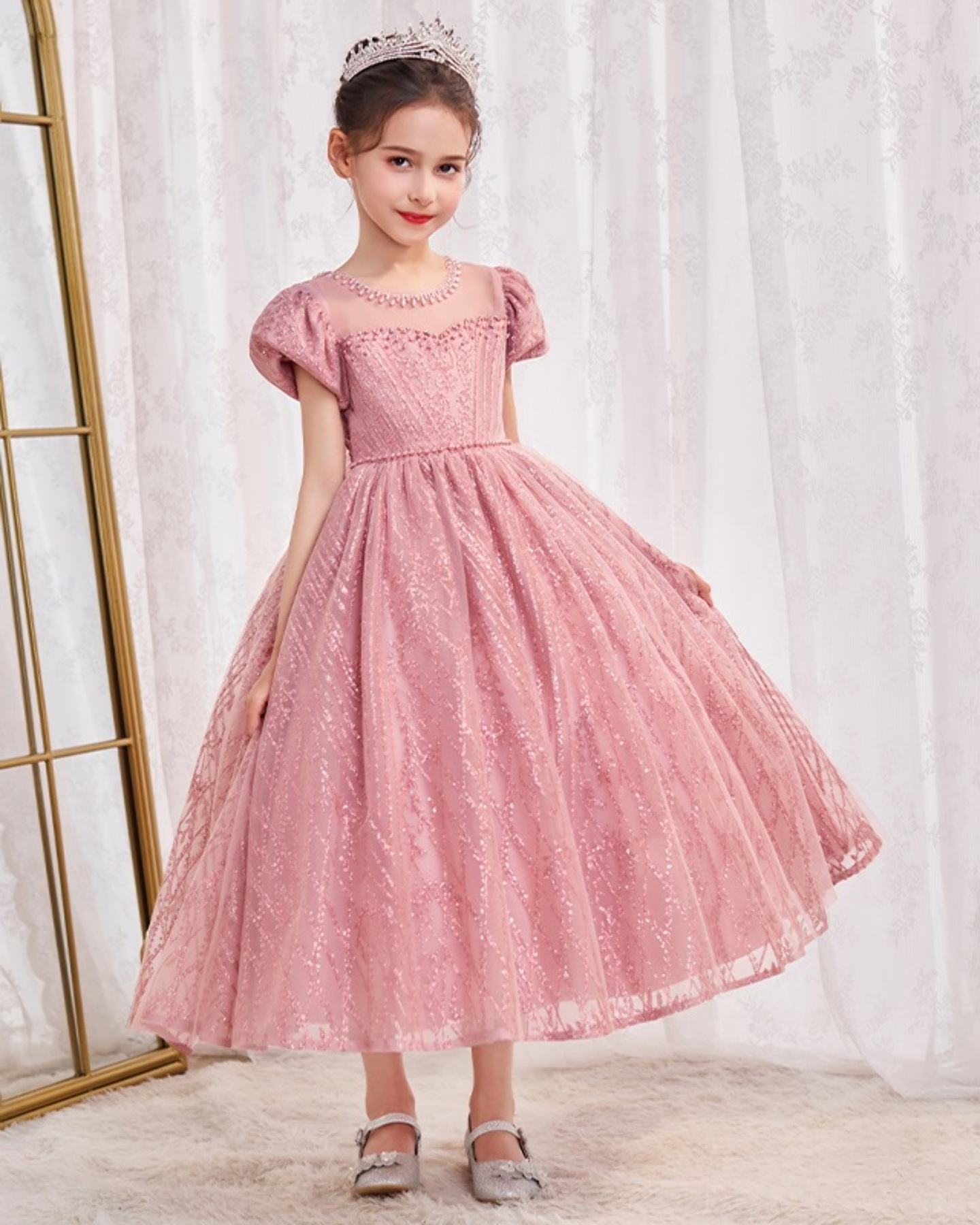 Girls Sequin Flower Girl Party Dress - Miranda (Dusty Pink)