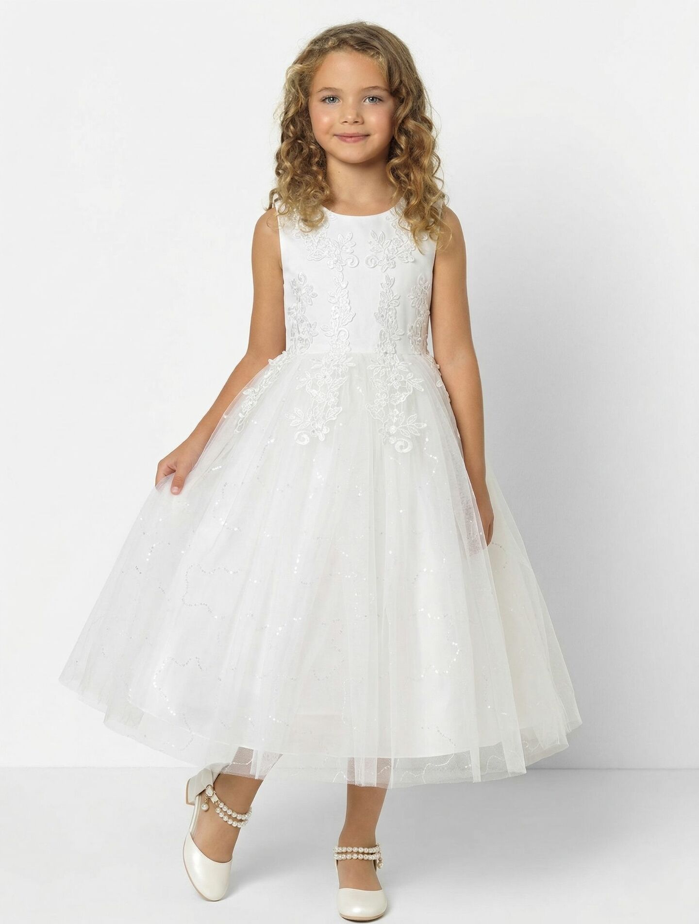 The ideal dress for First Holy Communion, Confirmation ceremonies, flower girl duties at church weddings, Easter celebrations, and any distinguished religious occasion where pure white tradition, modest elegance, and a touch of gentle luminosity are equally valued. The sleeveless design combined with the modest round neckline creates a respectful silhouette suitable for most parish dress codes, while the glitter tulle adds just enough sparkle to make her feel truly special on her most important day.