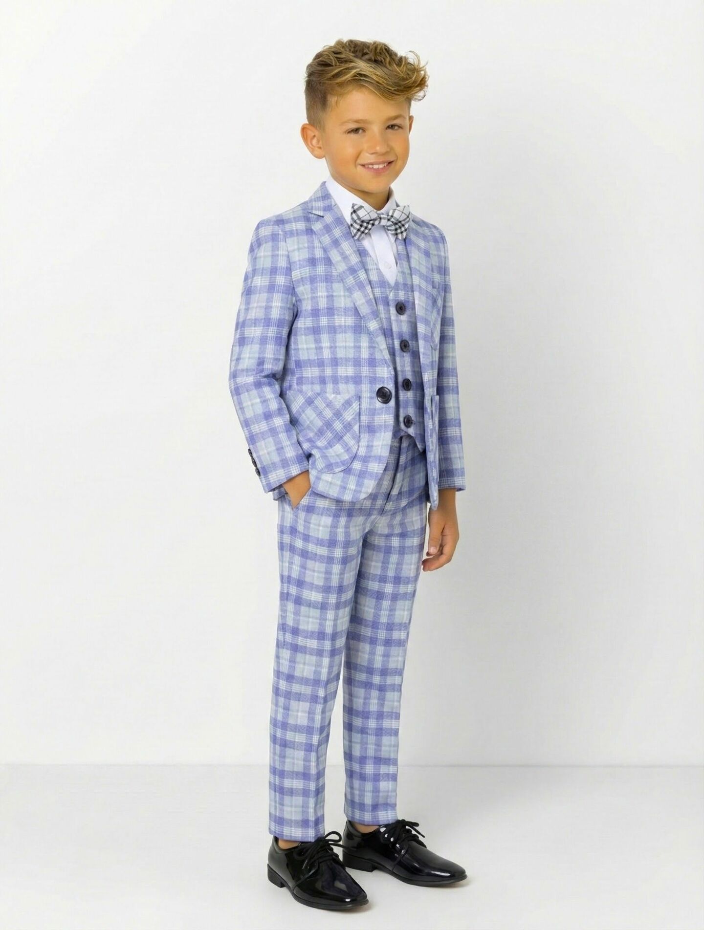 Harry Light Blue Lavender Plaid Boys 3-Piece Suit with Elbow Patches – Jacket, Waistcoat & Trousers | Lucy's
