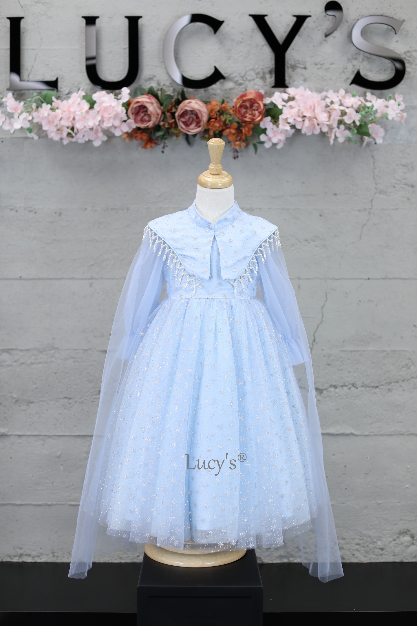 Presenting our Long-Sleeve Light Blue Party Dress with Cape for girls, an enchanting choice for birthday parties and other special occasions. This beautiful ensemble is crafted from premium fabric with professional tailoring and fine handwork. The matching cape adds a touch of magic and whimsy, perfect for your little princess. The light blue color imbues an air of elegance and charm, sure to make your little one the belle of any ball.