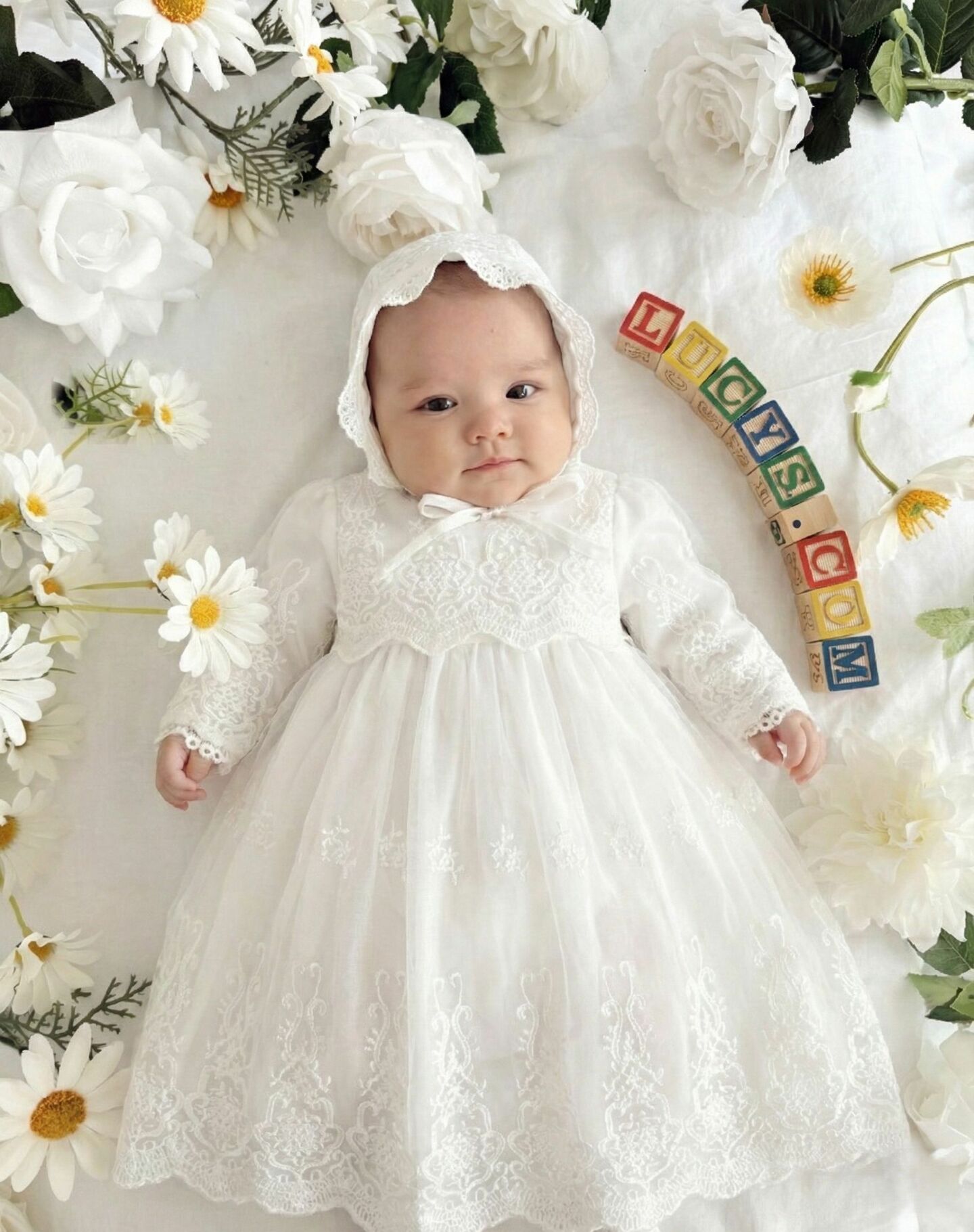 - Matching embroidered lace bonnet