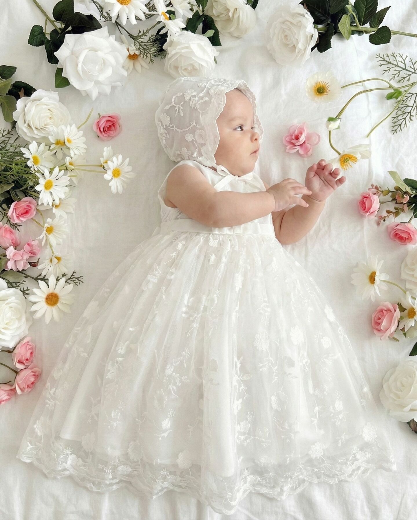 The breathable construction and sleeveless design make this gown perfect for summer ceremonies in warm climates or air-conditioned venues where a light layer is all that's needed. This dress transitions beautifully from christening gown to special occasion dress for summer birthdays, garden parties, beach portraits, and family celebrations. Pair with the matching bonnet for traditional ceremonies or substitute with a delicate flower crown, fresh floral clips, or pearl headband for a more contemporary summer garden aesthetic. The versatile white color pairs beautifully with pastel accessories and coordinates perfectly with summer blooms for outdoor ceremony photos. Consider adding a lightweight white cardigan or bolero for air-conditioned churches or indoor venues, easily removed for outdoor portions of the celebration.
