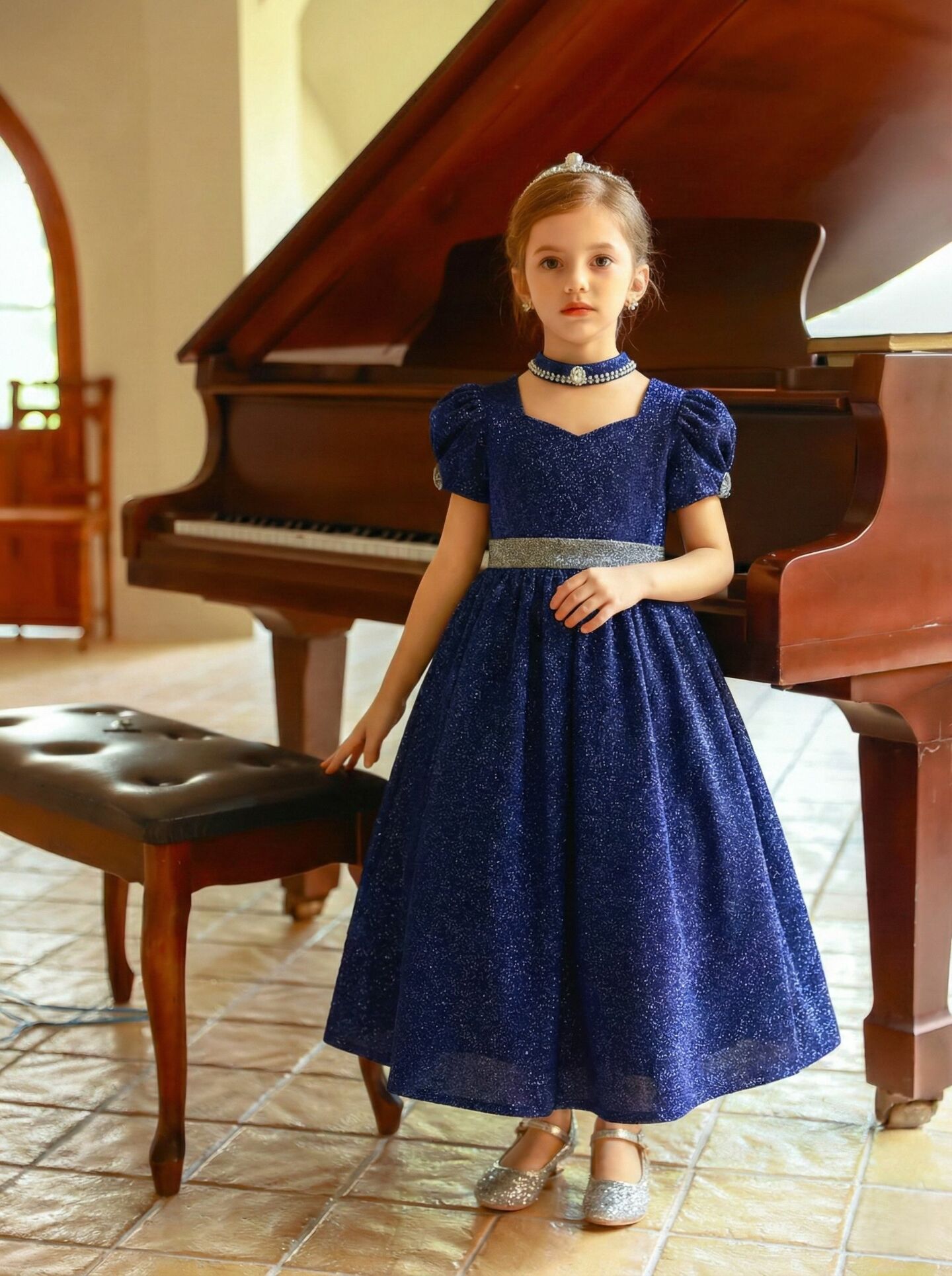 Captivate every celebration with the Julia dress, a breathtaking navy formal gown crafted in luxurious glitter fabric that catches the light beautifully with every movement. This show-stopping girls' formal dress combines vintage-inspired elegance with princess-worthy drama, making it the perfect choice for weddings, formal celebrations, and milestone events.