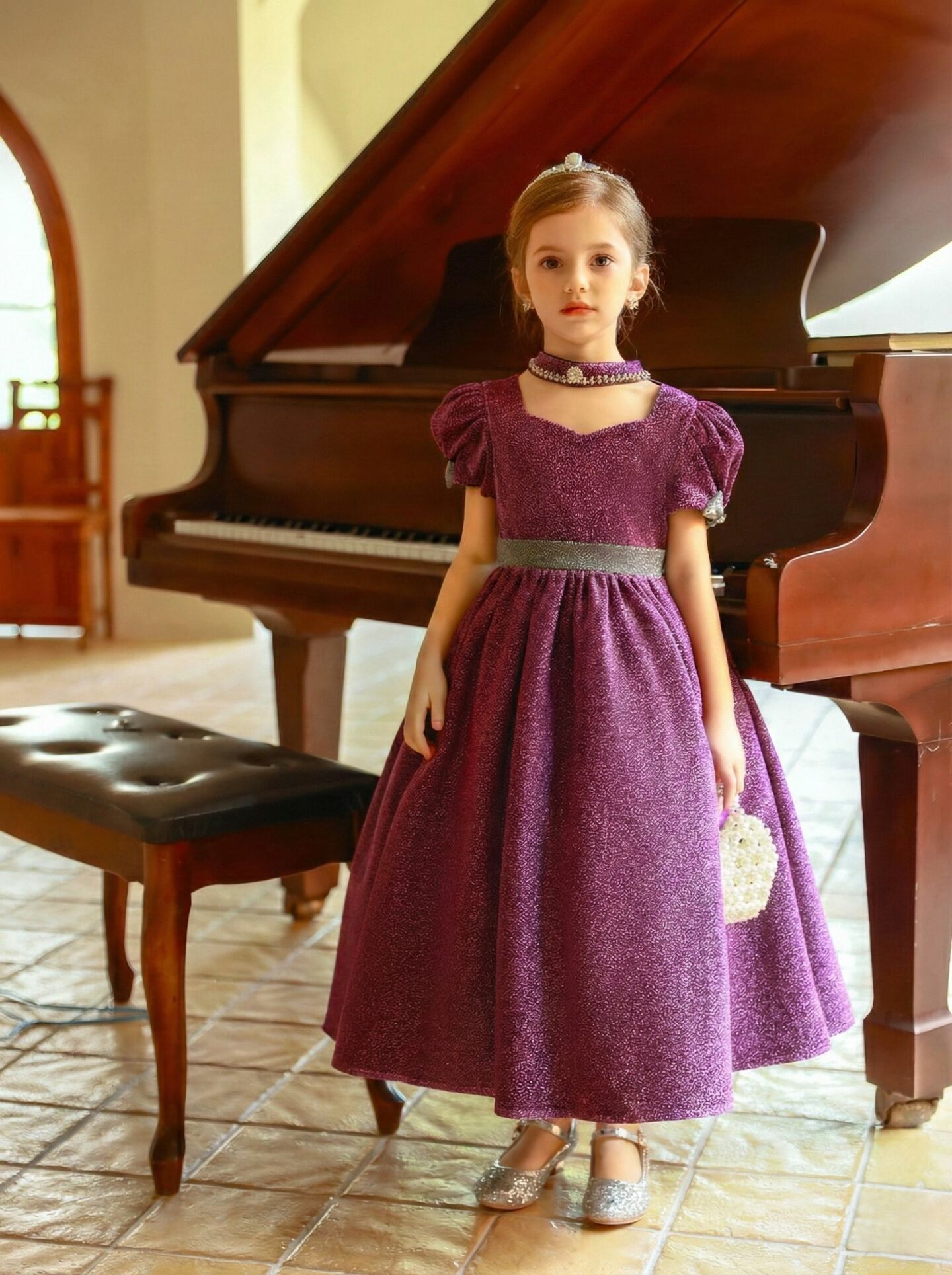 Captivate every celebration with the Julia dress, a breathtaking plum formal gown crafted in luxurious glitter fabric that catches the light beautifully with every movement. This show-stopping girls' formal dress combines vintage-inspired elegance with princess-worthy drama, making it the perfect choice for weddings, formal celebrations, and milestone events.