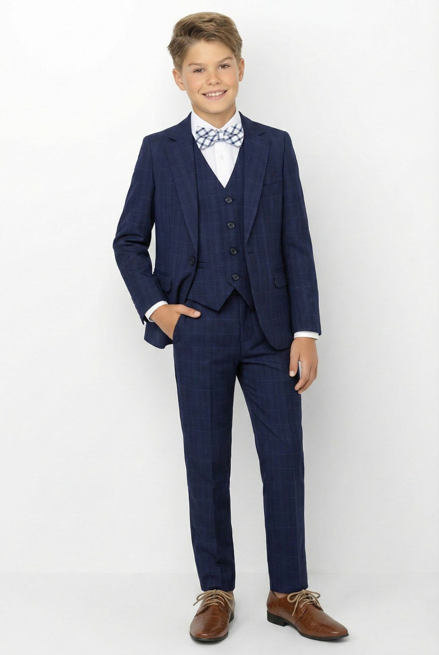 Perfect for ring bearers, page boys, formal weddings, communion celebrations, bar mitzvahs, formal family portraits, and special occasions requiring classic formal elegance. The sophisticated navy windowpane pattern offers refined style that photographs beautifully while remaining appropriate for traditional formal events.