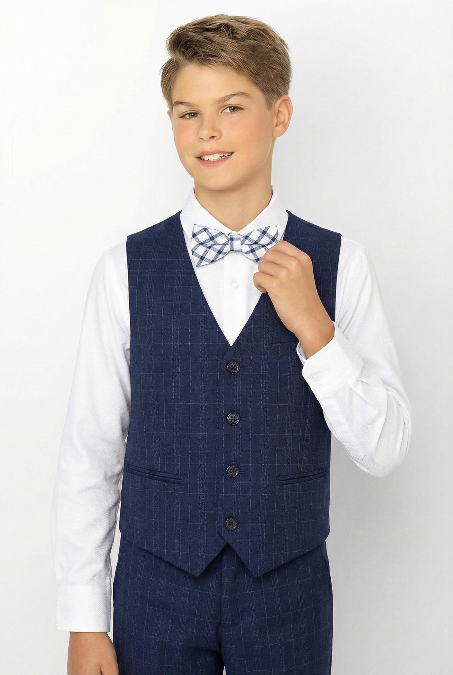 Justin Navy Windowpane Four-Button Boys Waistcoat | Lucy's