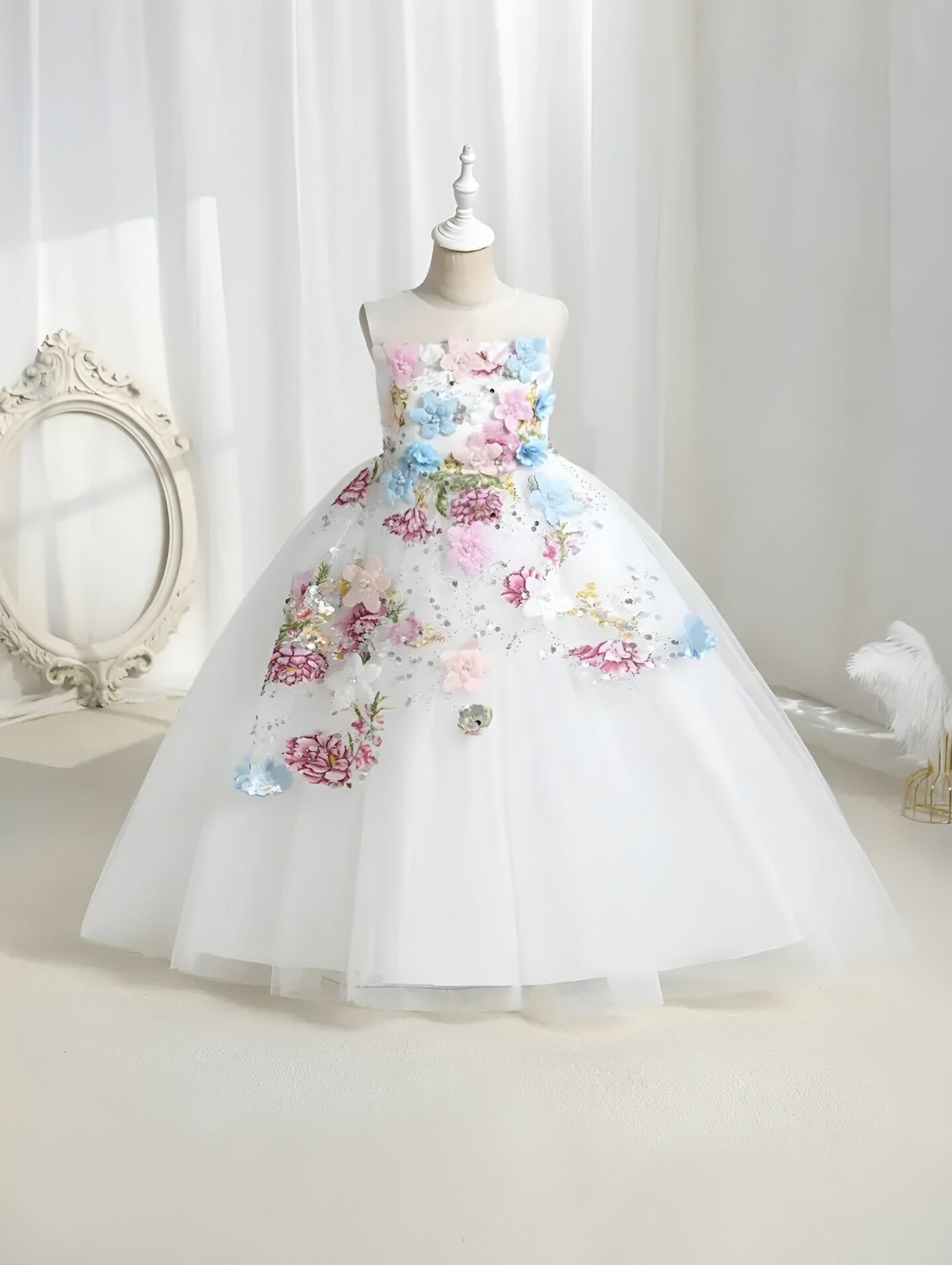 Step into a fairytale garden with the enchanting Lila dress, a breathtaking ball gown adorned with floral embellishments in a beautiful palette of pink, blue, yellow, and white blooms. This show-stopping flower girl dress brings whimsical garden party charm to any celebration.