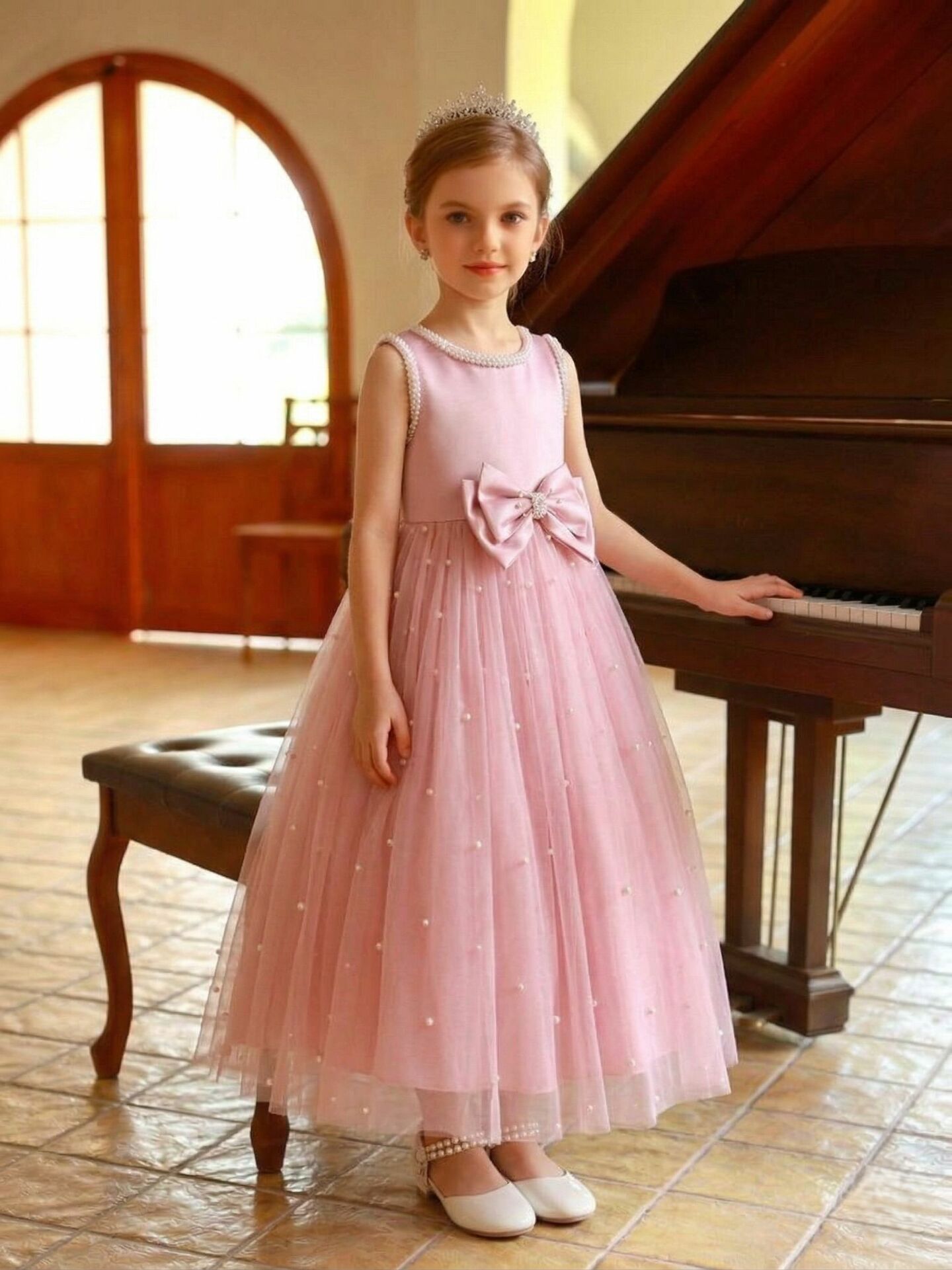 Styling Tips: Complete this ethereal ensemble with white Mary Jane heels adorned with pearl ankle straps, a crystal tiara, and a delicate pearl necklace to echo the dress's exquisite pearl detailing. For First Communion, add white gloves and a simple white veil for a truly traditional and memorable look.
