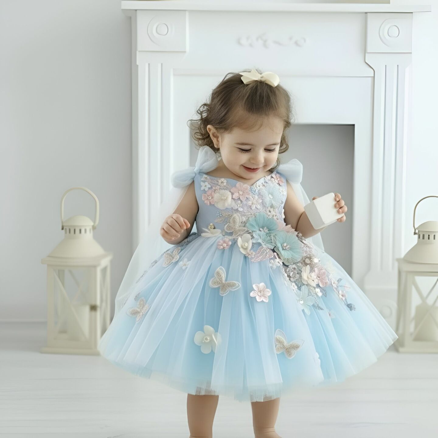 Transform your little one into a fairytale princess with this enchanting baby blue dress, designed to capture hearts at every special occasion. This whimsical flower girl dress features delicate 3D butterfly and floral embellishments that bring a magical garden aesthetic to life.