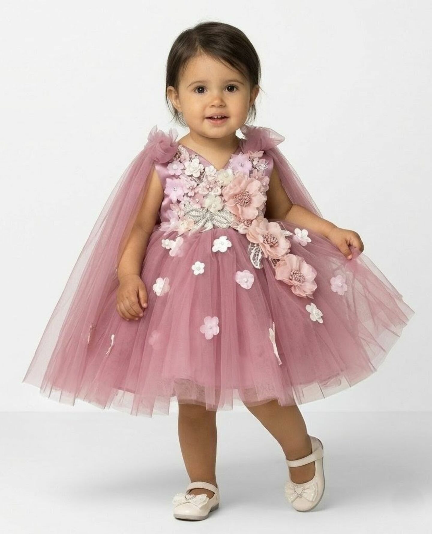 Transform your little one into a fairytale princess with this enchanting dusty pink dress, designed to capture hearts at every special occasion. This whimsical flower girl dress features delicate 3D butterfly and floral embellishments that bring a magical garden aesthetic to life.