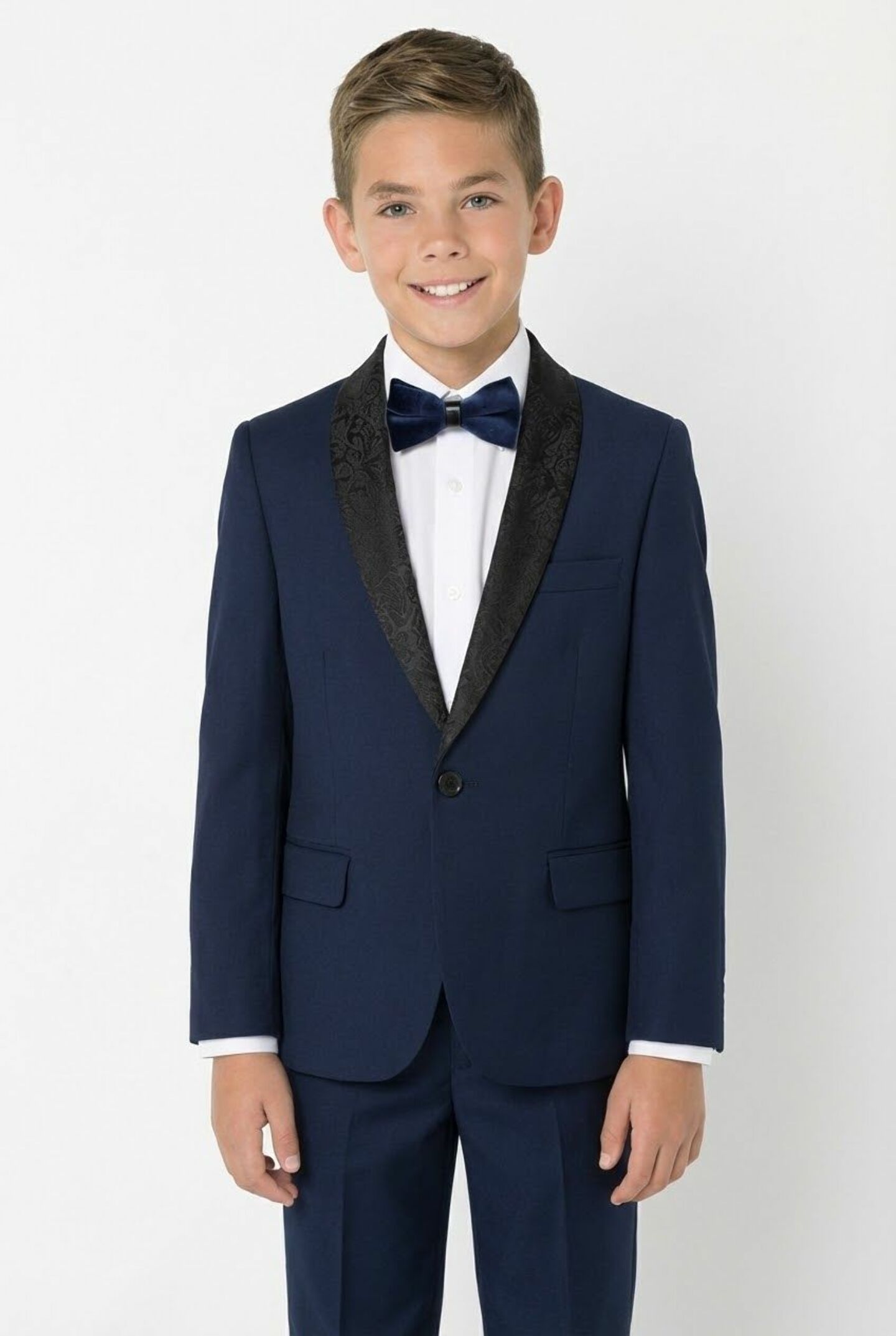 Elevate any formal outfit with the Marseille blazer in sophisticated navy featuring an elegant black paisley shawl lapel. This tuxedo-style jacket brings refined formal elegance with its distinctive shawl collar design that pairs beautifully with black or navy trousers you already own, making it a statement piece for boys' formal wardrobes.