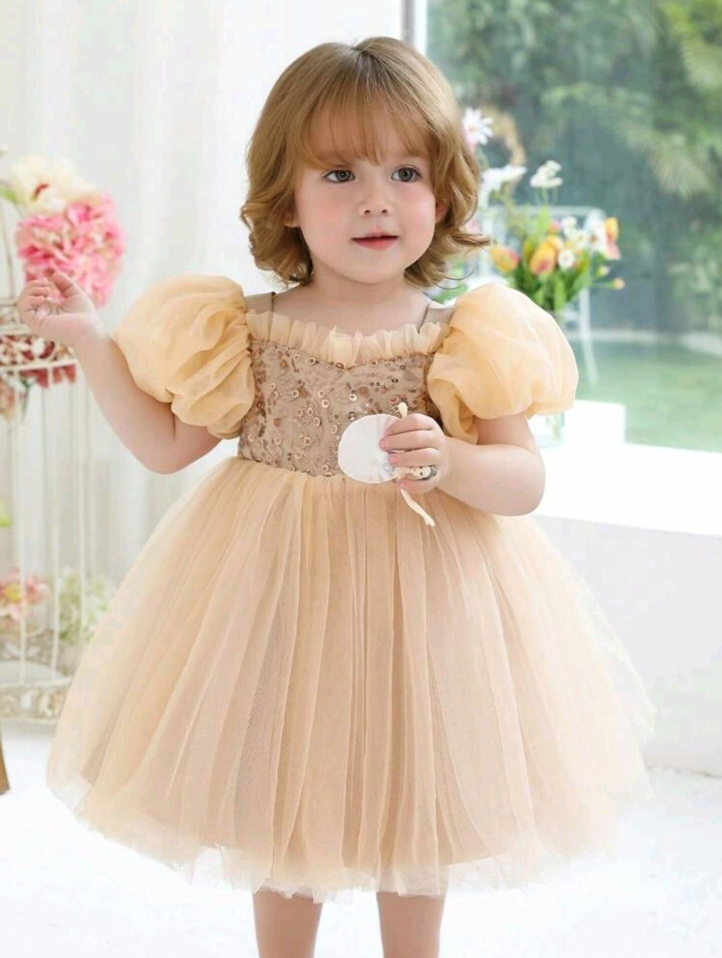 This versatile party dress is ideal for first birthday celebrations, flower girl duties, christenings, holiday gatherings, family photos, weddings, or any special occasion where your little one deserves to shine. The warm champagne hue complements all skin tones and pairs beautifully with gold or rose gold accessories.