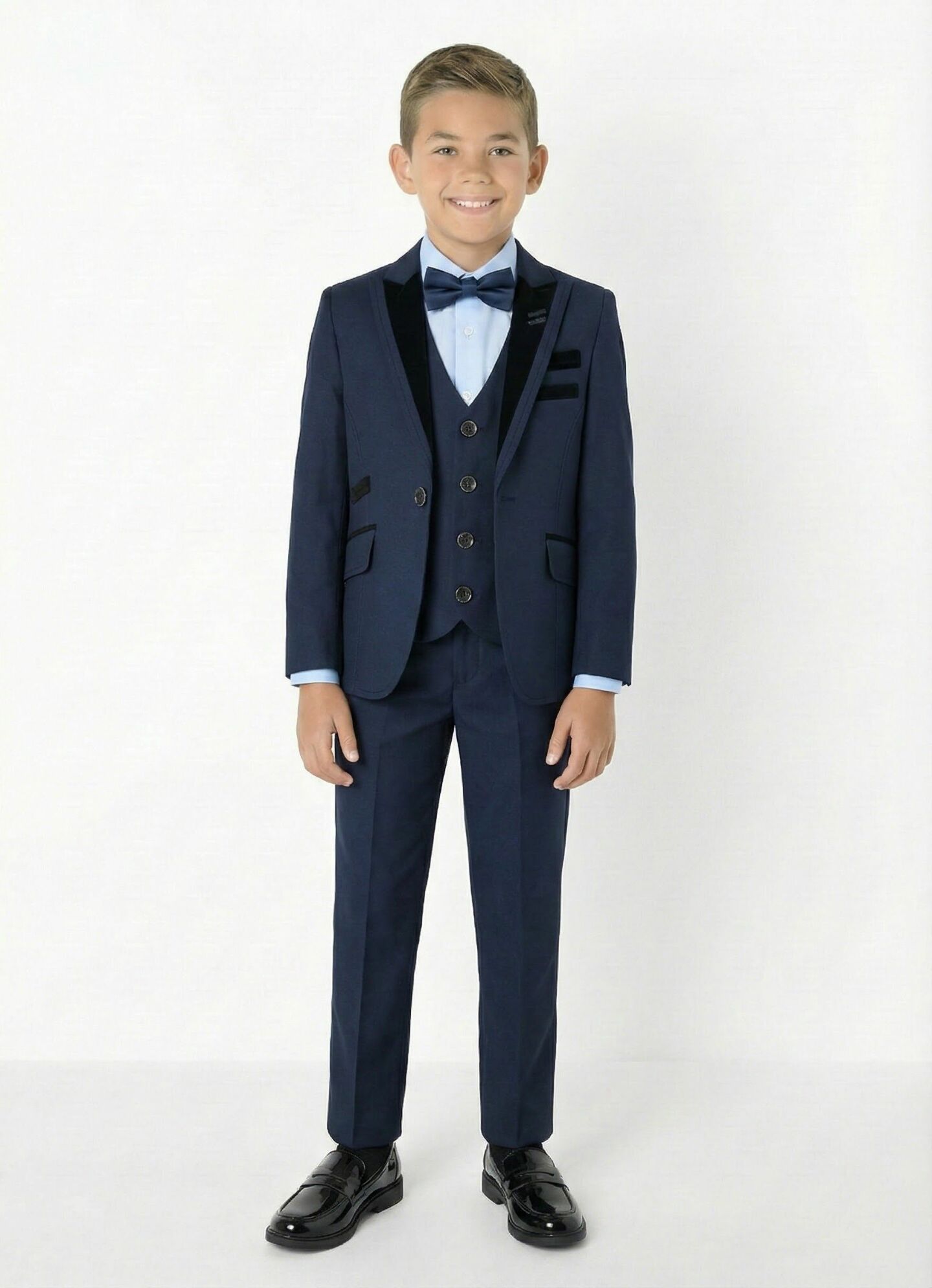 Monte Carlo Navy Boys 3-Piece Suit with Black Velvet Trim – Jacket, Waistcoat & Trousers | Lucys