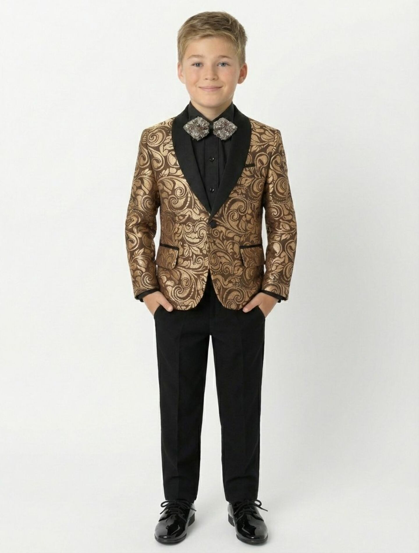 Achieve red-carpet-worthy style with the Robert 2-piece suit featuring a striking bronze jacquard brocade blazer paired with tailored black dress trousers. This elegant combination delivers bold sophistication perfect for boys attending upscale weddings, evening celebrations, and black-tie events.
