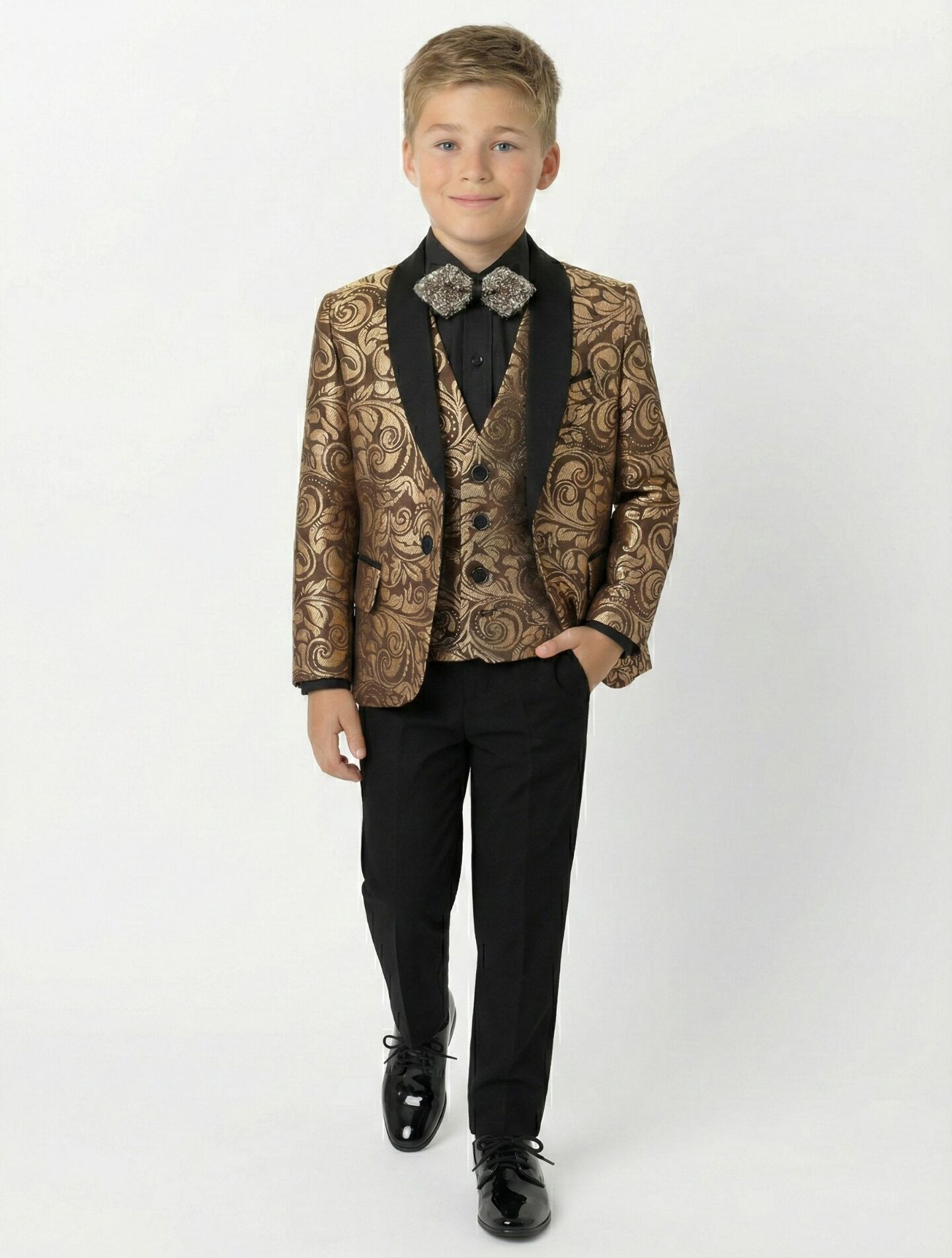 Perfect for ring bearers, page boys, weddings with brown, bronze or glamorous colour themes, prom, black-tie celebrations, holiday galas, New Year's Eve parties, bar mitzvahs, and special occasions where unforgettable formal elegance is desired. The rich bronze brocade photographs stunningly and pairs beautifully with events featuring warm metallic, champagne, or jewel-toned colour palettes.