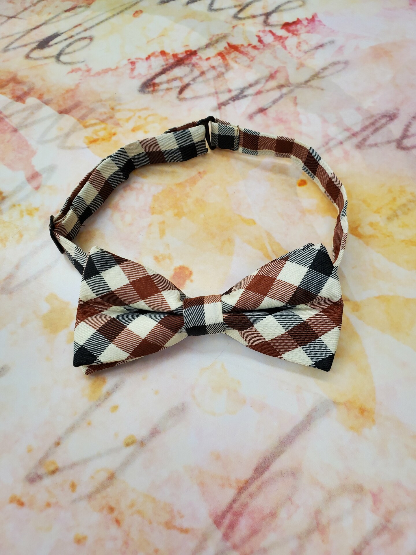 Satin Bow Tie - Beige, Brown, Plaid