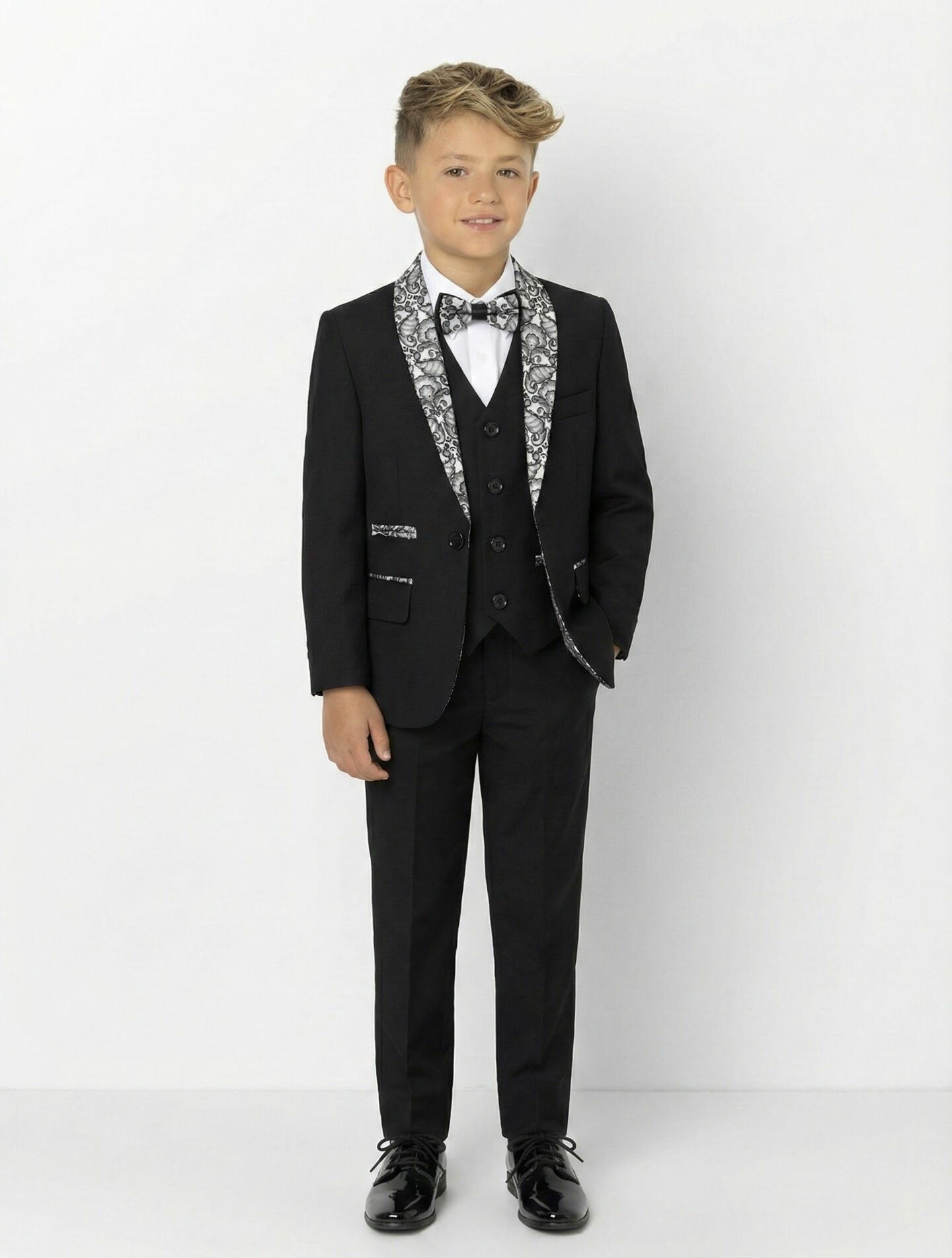 The grey paisley accent on the jacket lapels and pocket trim creates elegant visual interest while maintaining sophisticated formal appeal. This striking combination stands apart from traditional plain suits, offering boys a fashion-forward look that photographs beautifully.