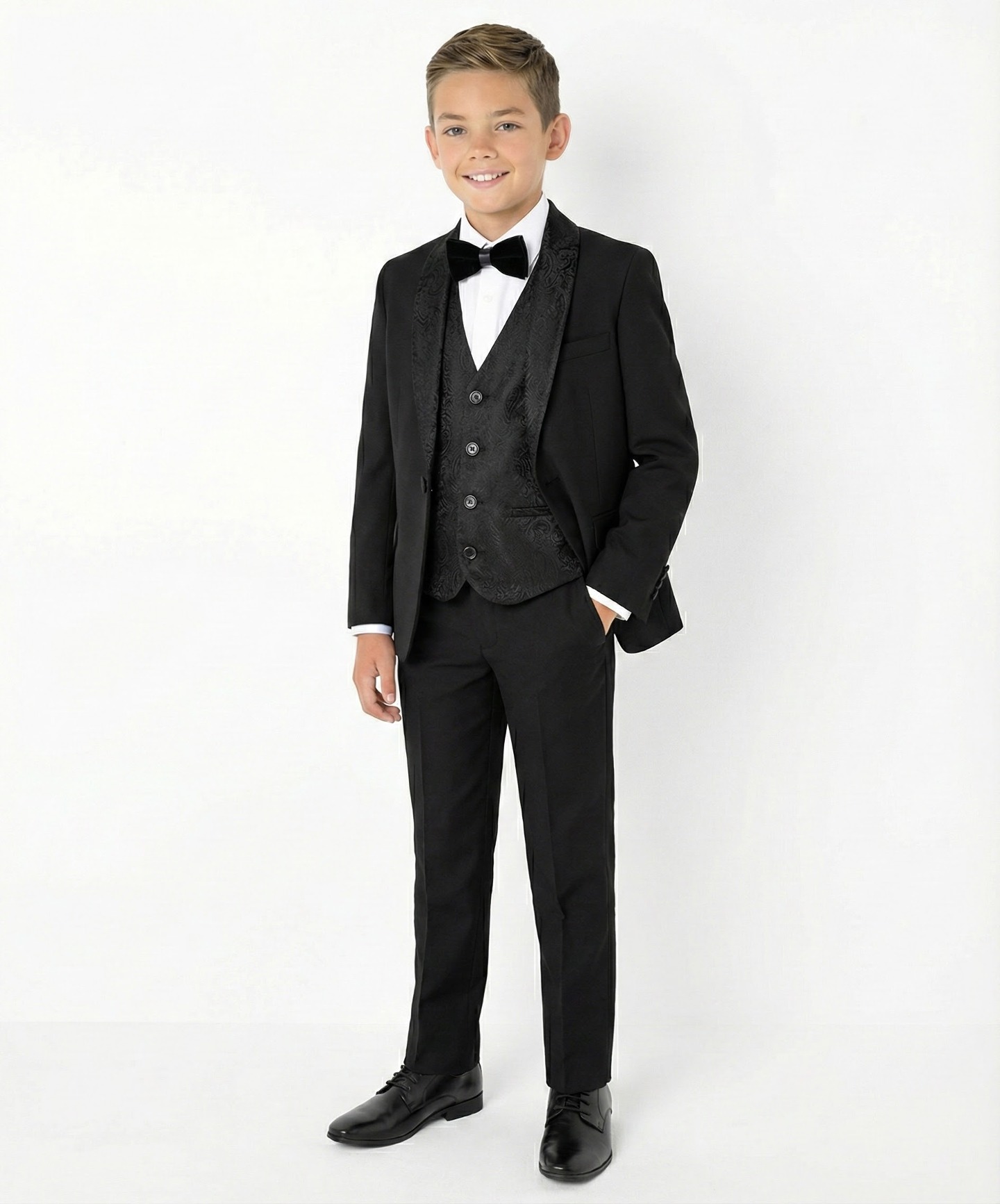 Perfect for ring bearers, page boys, proms, black-tie weddings, evening galas, bar mitzvahs, and special occasions where distinguished formal elegance is desired. The black and black paisley combination offers a modern twist on classic tuxedo styling.