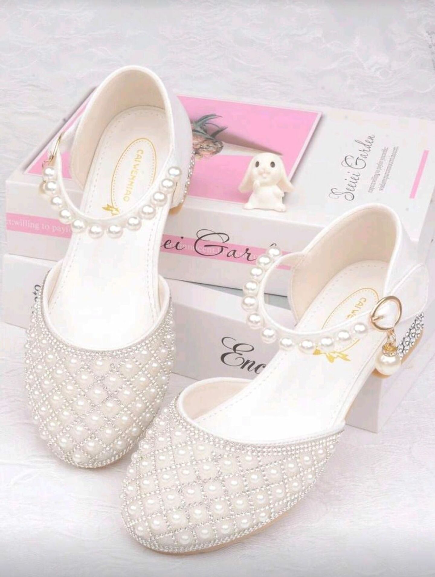 - Pearl-adorned ankle strap with golden bow charm