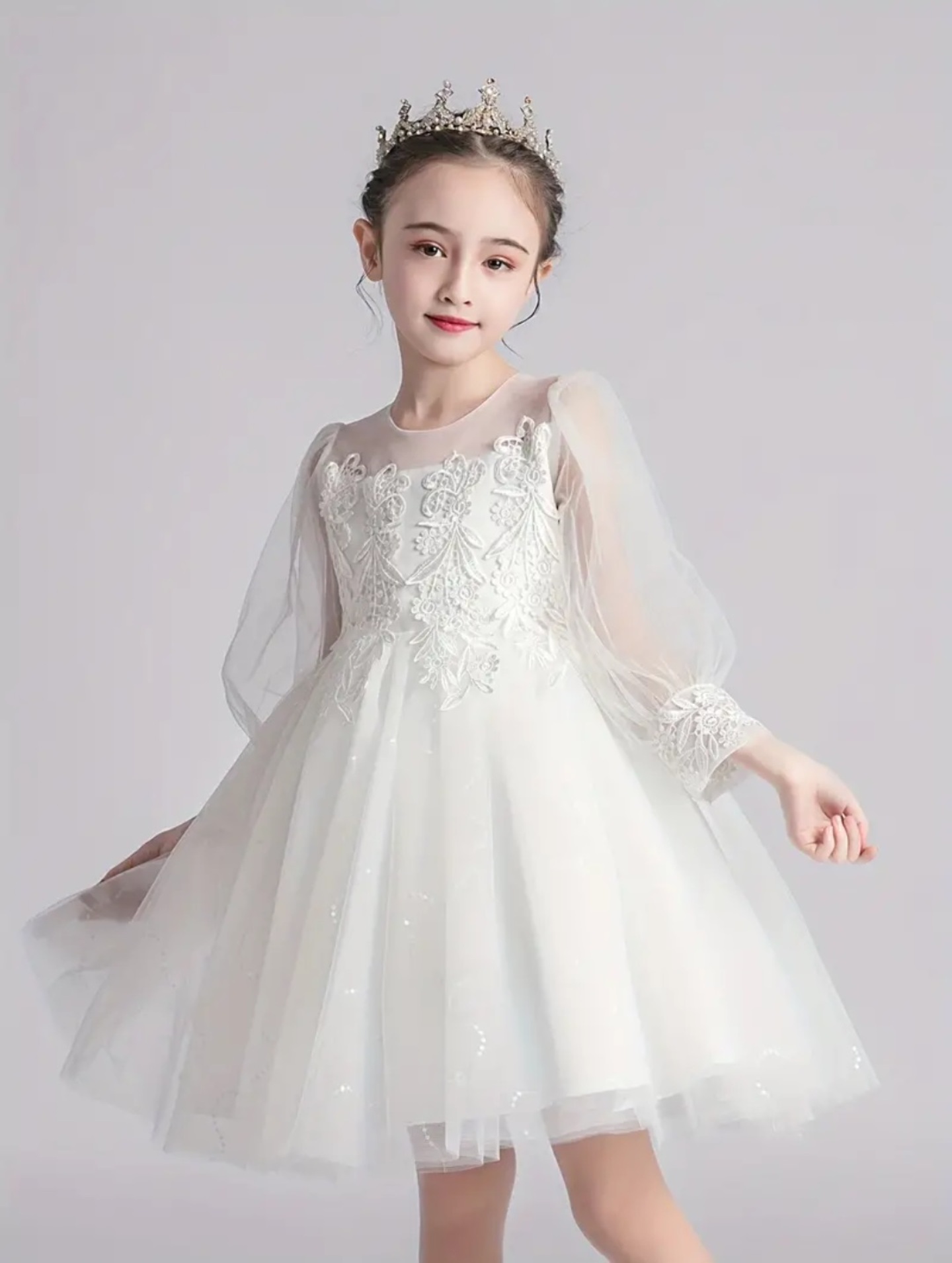 Young Girls Long Sleeve Lace Wedding Bridesmaid Party Dress - Kayla (White)